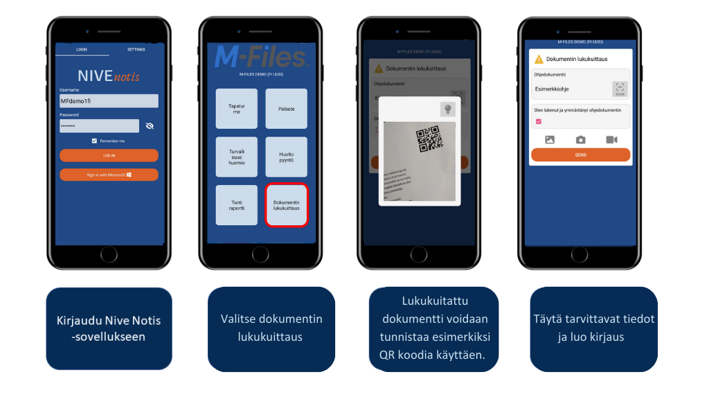 Ohjeiden lukukuittausten tekeminen tehdasalueella, toimiston työpöydän ja tietokoneen sijaan, onnistuu helposti puhelimella käyttäen Nive Notis -sovellusta. Tässä käyttötarpeessa sovelluksen yhdeksi havainnoksi on konfiguroitu ”dokumentin lukukuittaus”. Lukukuitattu dokumentti voidaan joko valita listalta tai tunnistaa helposti paikan päällä esimerkiksi QR-koodia tai NFC-tunnistetta käyttäen.